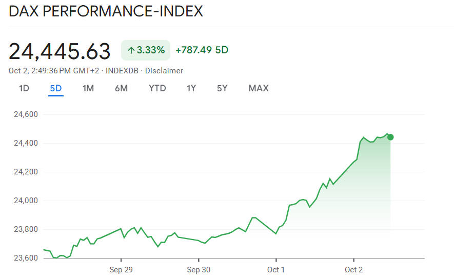 Schon im frühen Handel zeigten sich starke Impulse. Der EuroStoxx50 sprang zeitweise auf 5.643,85 Punkte und markierte damit einen neuen Spitzenwert. Der Dax bewegte sich ebenfalls in Rekordnähe und legte zwischenzeitlich um 0,9 Prozent auf 24.338 Punkte zu. Sein bisheriges Allzeithoch liegt bei 24.631 Punkten – die Marke ist damit in Reichweite.