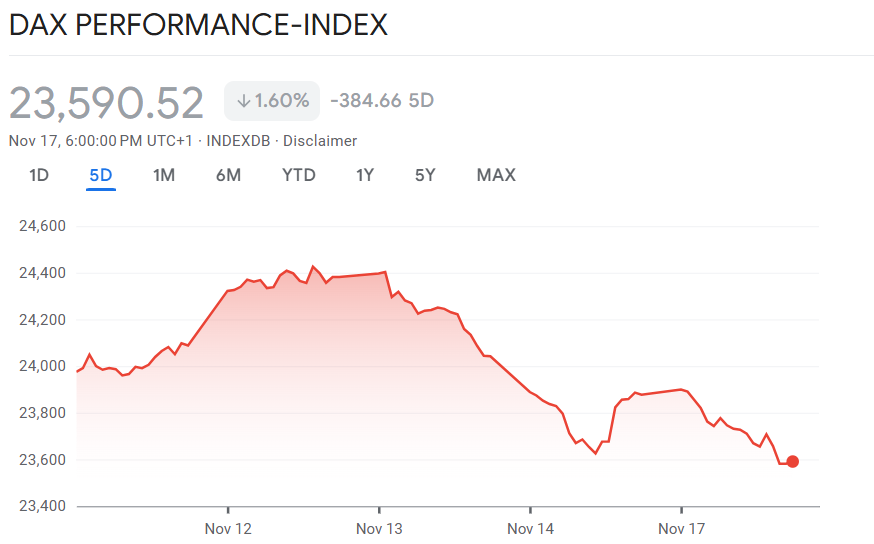 Die deutschen Aktienmärkte haben eine weitere deutliche Korrektur erlebt. Der Dax verlor am Montag 1,2 Prozent und rutschte zum Handelsschluss auf 23.591 Punkte ab. Auch der EuroStoxx50 konnte dem negativen Trend nicht entkommen und schloss 1,1 Prozent niedriger bei 5630 Zählern.