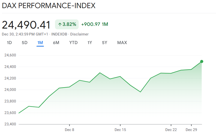Zum Handelsschluss verbuchte der Dax ein Plus von 0,6 Prozent und schloss bei 24.490 Punkten. Damit setzte der Index einen freundlichen Akzent unter den Jahresausklang. Rückblickend fällt die Bilanz für 2025 ausgesprochen positiv aus: Auf Jahressicht legte der deutsche Leitindex um mehr als 22 Prozent zu und markierte damit eines der erfolgreichsten Jahre seiner Geschichte.