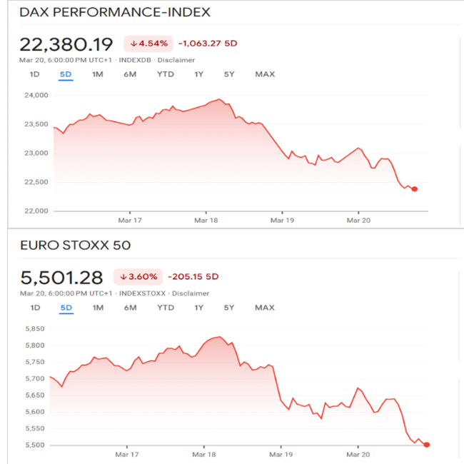 Am Ende stand ein Minus von 2,0 Prozent, der deutsche Leitindex schloss bei nur noch 22.385 Punkten. Auch der gesamteuropäische EuroStoxx50 geriet spürbar unter Druck und fiel um 1,7 Prozent auf 5.518 Punkte. Damit setzte sich die negative Entwicklung an Europas Börsen fort. Die Woche hinterließ bei vielen Investoren vor allem ein Gefühl: Unsicherheit.
