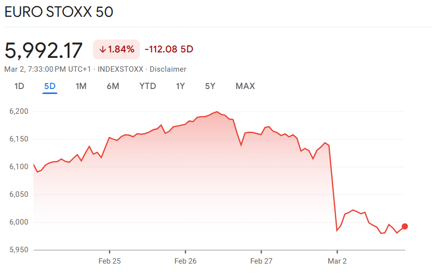Die Schwäche beschränkte sich nicht auf Deutschland. Der europäische Leitindex EuroStoxx50 sank um 2,0 Prozent auf 6.018 Punkte. Auch hier überwogen Abgaben deutlich.