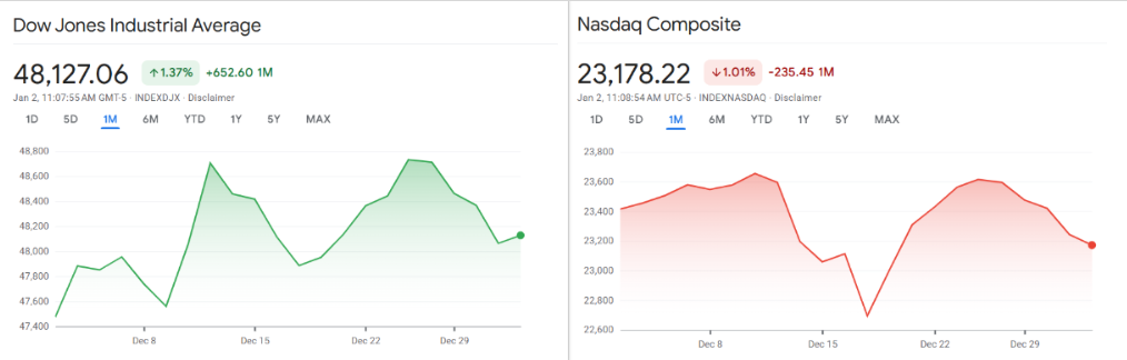Der Nasdaq Composite verbuchte auf Jahressicht ein Plus von rund 20 Prozent. Treibende Kraft war vor allem der anhaltende Boom rund um Künstliche Intelligenz und technologiebezogene Investitionen. Der S&P 500 konnte um etwa 16 Prozent zulegen, während der Dow Jones Industrial Average einen Zuwachs von rund 13 Prozent erzielte.