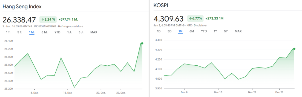In Asien starteten mehrere Börsenplätze mit deutlichen Kursgewinnen ins neue Jahr. Besonders stark präsentierte sich der Markt in Hongkong, wo der Hang Seng Index zeitweise um bis zu 2,8 Prozent zulegte. Vor allem Aktien aus dem Technologie- und KI-Sektor sorgten für Auftrieb; entsprechende Teilindizes gewannen jeweils mehr als drei Prozent.