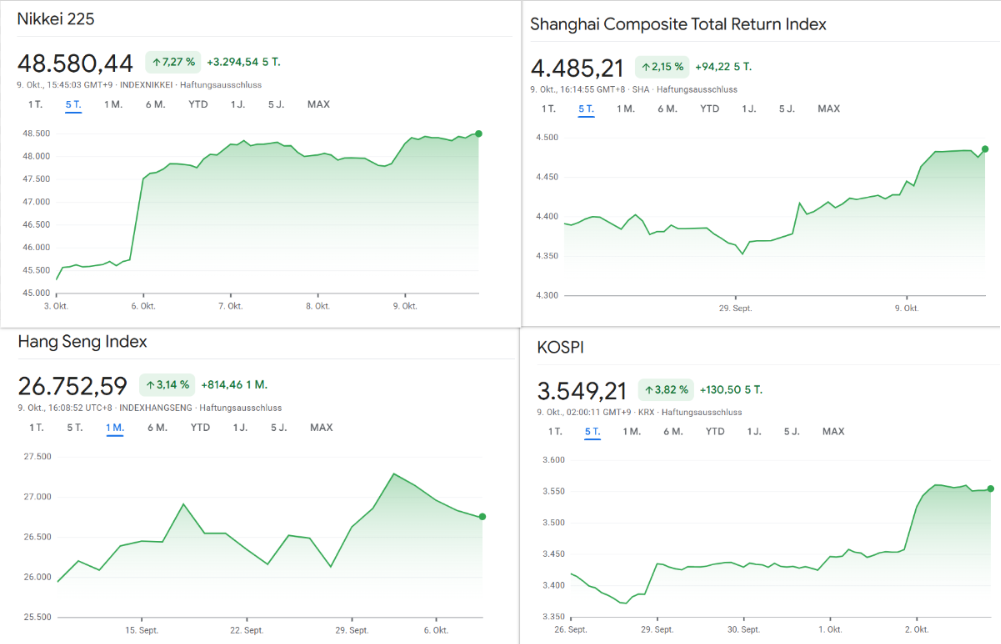 Die asiatischen Aktienmärkte starteten den Donnerstag mit kräftigen Gewinnen. Vor allem Japan und China sorgten für positive Impulse. Der Nikkei-Index in Tokio stieg um 1,5 Prozent auf 48.436 Punkte und nähert sich damit weiter seinem Rekordhoch. Auch in Schanghai legten die Kurse nach der „Golden Week“-Pause spürbar zu, der Shanghai Composite gewann 1,2 Prozent.