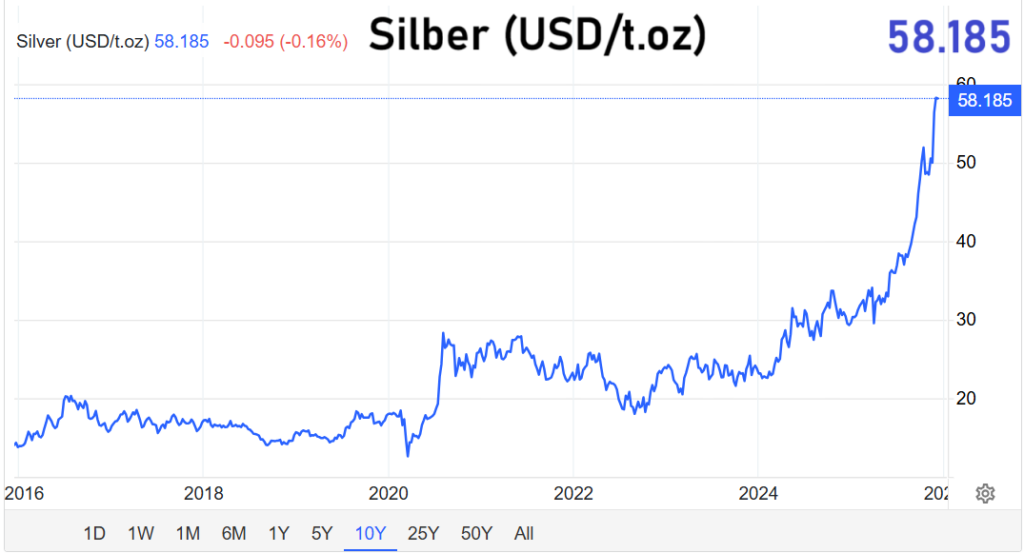 Während Gold bereits kräftig zugelegt hat, fällt der Kursanstieg bei Silber noch markanter aus. Seit Beginn des vierten Quartals ist der Preis um rund 25 Prozent gestiegen.