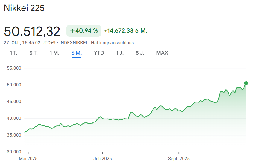 Zum Wochenauftakt herrscht an den internationalen Finanzmärkten spürbarer Optimismus. Die Hoffnung auf eine Annäherung im Handelskonflikt zwischen den USA und China sorgt für steigende Kurse in Asien und ein positives Sentiment an den Terminmärkten. In Japan kam es zu einem historischen Meilenstein: Der Nikkei 225 überschritt erstmals die Marke von 50.000 Punkten und setzte damit ein klares Signal für das Vertrauen der Anleger in die wirtschaftliche Erholung.